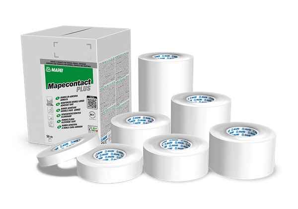 A MAPECONTACT PLUS egy kétoldalas megerősített ragasztószalag profilok, szegélylécek, burkolatok, valamint rugalmas és textil bevonatok lépcsőfokokra történő fektetéséhez.