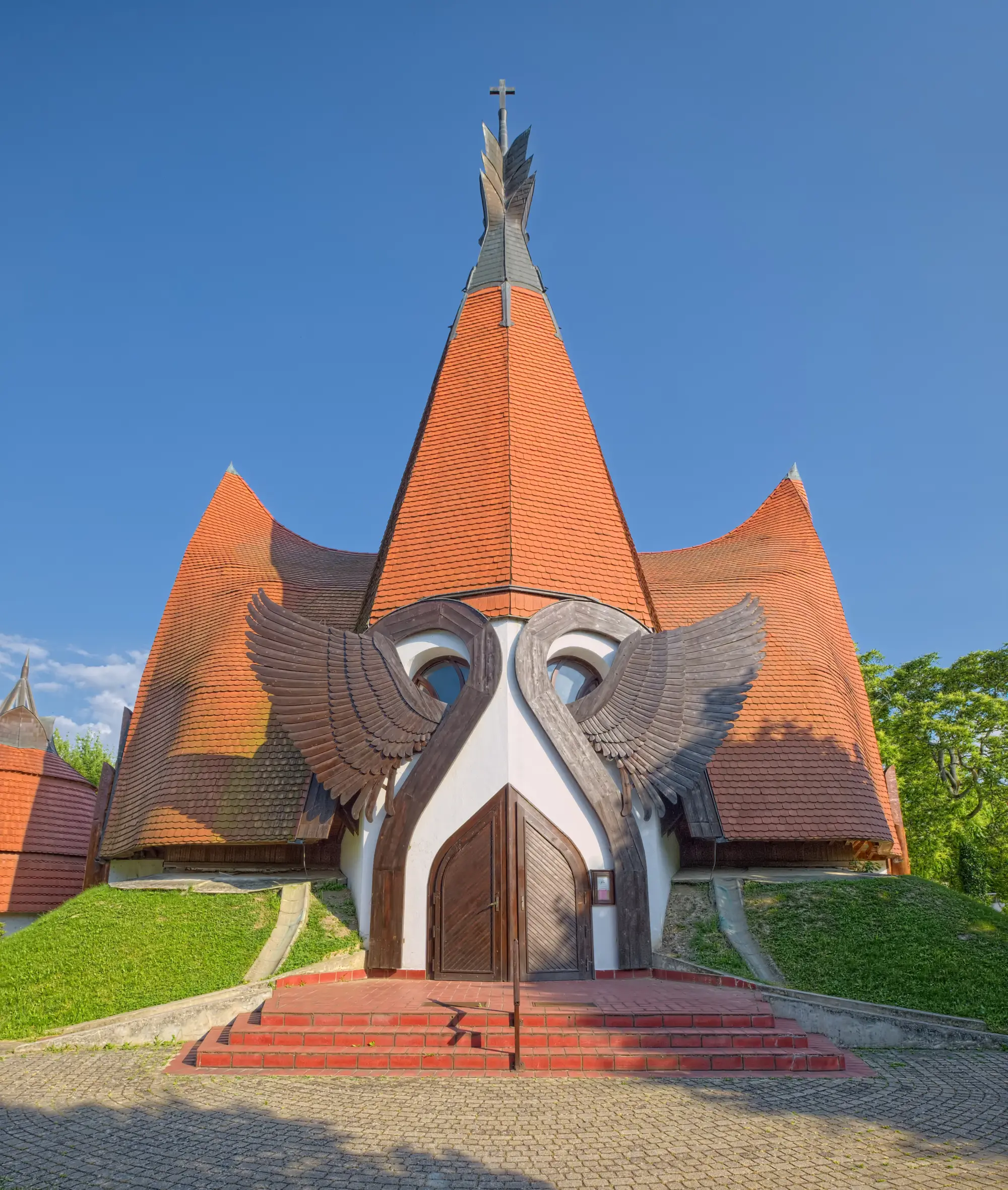 Makovecz Imre siófoki evangélikus templomának bár nincs túlbonyolítva a szerkezete, és az anyaghasználat is kifejezetten hagyományos, mégis valódi tetőkülönlegesség ez is. Tulajdonképpen egy „csupatető″ ház, hiszen a cserépborítás szinte a földig ér. Az egyedi forma védőn borul templom fölé, mintha csak egy felfordított bárka lenne. A toronyként is értelmezhető tetőcsúcs az izgalmas belső szerkezettel és az „emberarcú″ homlokzattal együtt az organikus építészet egyik legfontosabb alkotásává avatja a házat.