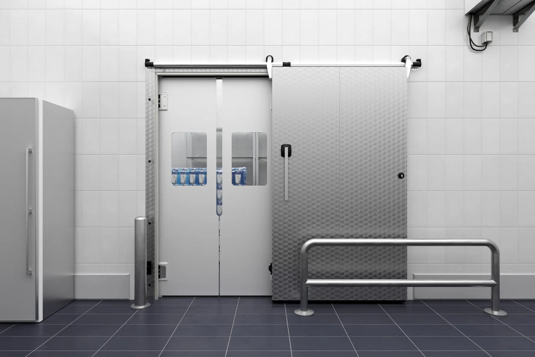 A szigetelő tolóajtók kiválóan kombinálhatók a Hörmann PE lengőajtókkal. Amíg a szigetelő tolóajtó nyitva van a fagyasztott áruk be vagy kitárolásához, a lengőajtó lezárja a mélyhűtött teret, így megakadályozva a hideg levegő kiszökését. Ezáltal csökkenthető az energiafogyasztás és növelhető az üzemeltetés hatékonysága.