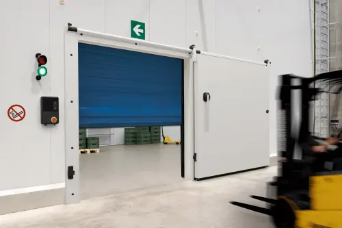 Továbbá a szigetelő tolóajtók az F 4010 Cold hajtogatott kapulapú gyorskapuval is kombinálhatók. Ez a háromrétegű, hőszigetelt kapulappal rendelkező flexibilis kapu 1 m/másodperces nyitási sebességet biztosít, ami elősegíti a gyors forgalomáramlást. Ezáltal minimalizálható a hőveszteség a nappali műveletek során, amikor a szigetelő tolóajtó nyitva van. Éjszaka pedig az optimális szigetelés érdekében a tolóajtó zárt állapotban marad, biztosítva a maximális hatékonyságot.