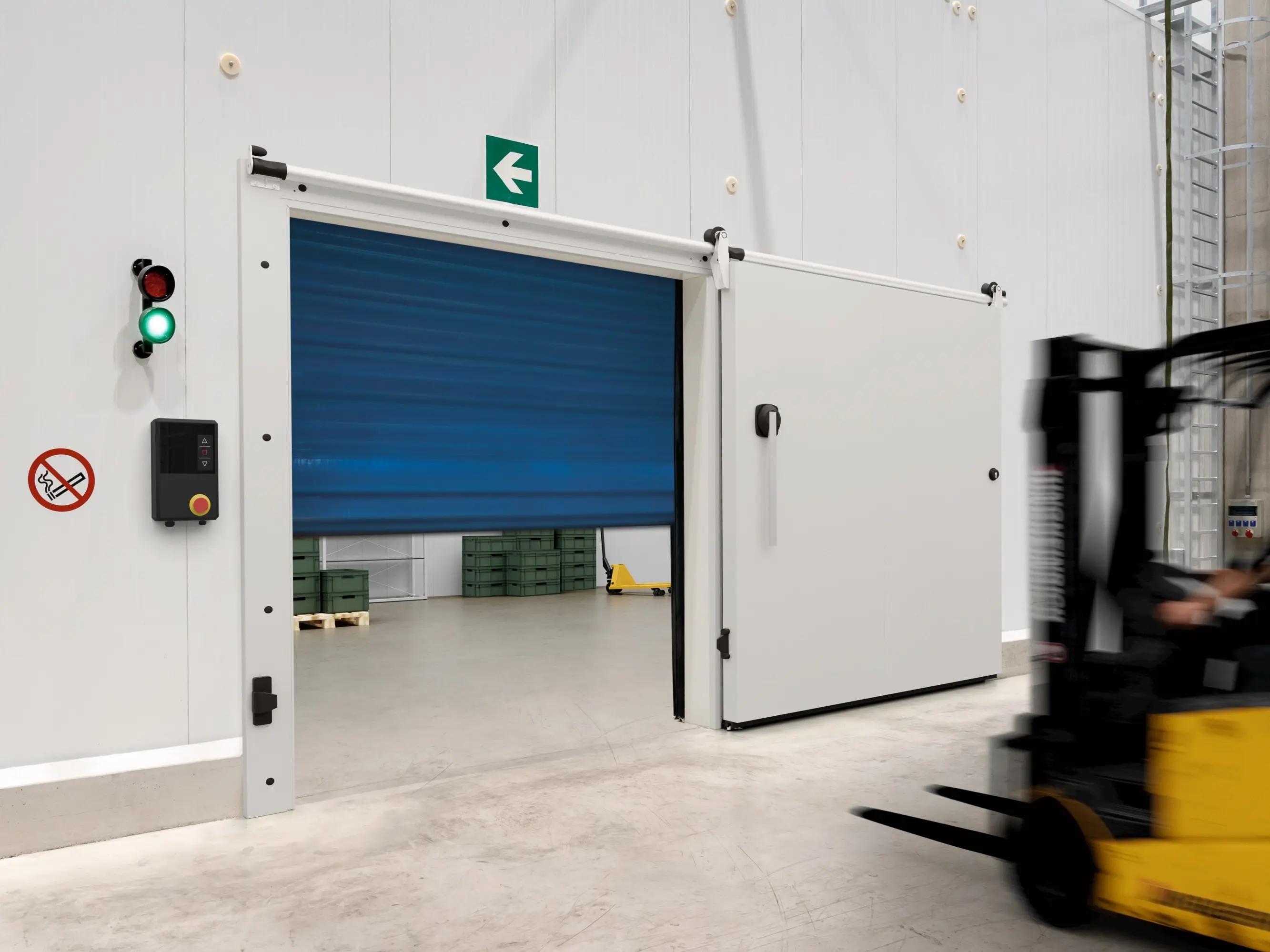 A tolóajtók kombinálhatók Hörmann PE lengőajtókkal. Miközben a tolóajtó nyitva van az áruk be- és kitárolásához, a zárt lengőajtó bent tartja a hideg levegőt, csökkentve ezzel az energiafogyasztást.