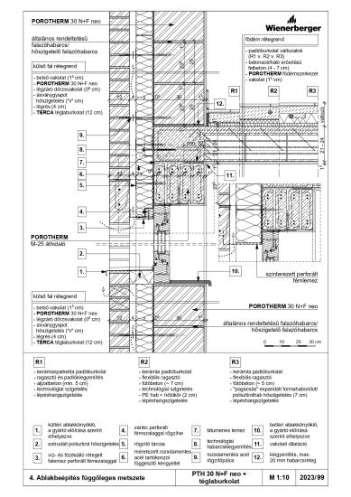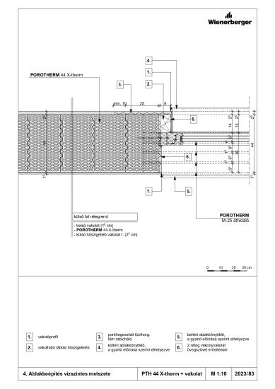 Ablakbeépítés vízszintes metszete - PTH 30 N+F neo + téglaburkolat