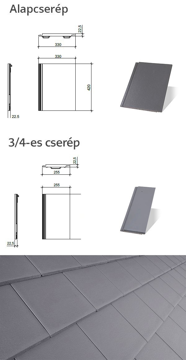 Az alapcserép a fedés alapeleme. A fedési szélesség az elem egész számú többszöröse legyen! A cserepeket kötésben, félcserépnyi eltolással kell beépíteni. A cserép sík alakjából adódóan nagyobb ellenlécvastagságok kialakítása ajánlott, mint a hullámos profilú termékvonalaknál.