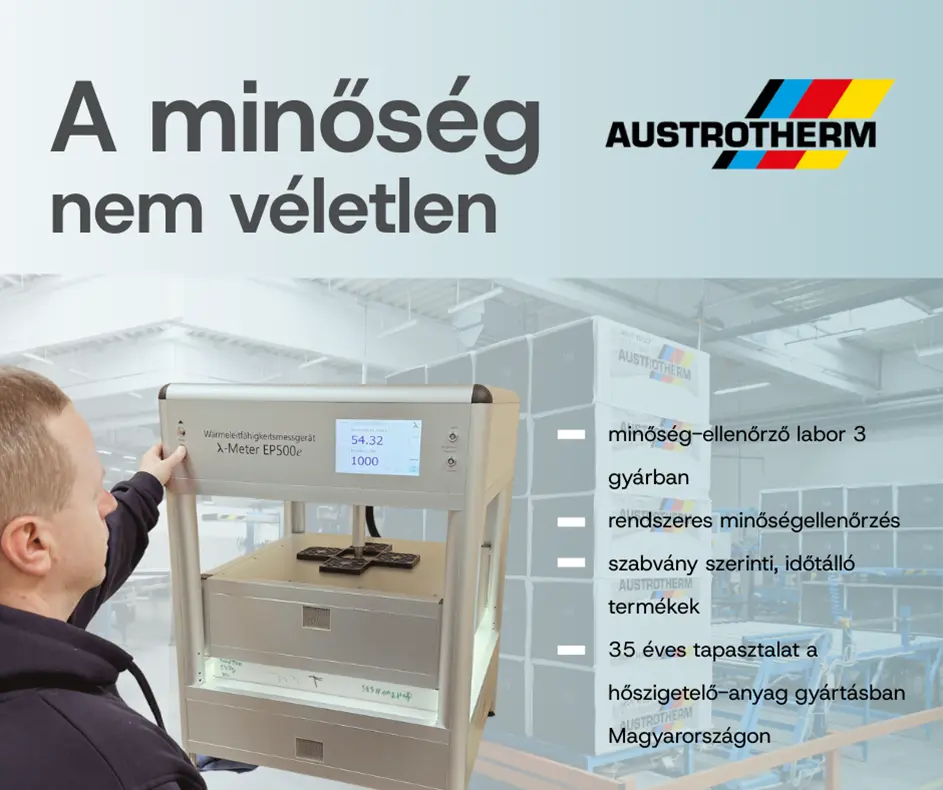 Az Austrotherm Kft. újabb lépést tett a minőség garanciája felé: győri és szekszárdi laboratóriumaiban a használt lambdamérő berendezéseket új, korszerű eszközökre cserélték. A fejlesztés célja, hogy a hőszigetelő anyagok vizsgálata gyorsabb, precízebb és megbízhatóbb legyen - hiszen az időtálló minőség nem ígéret, hanem mérhető tény.