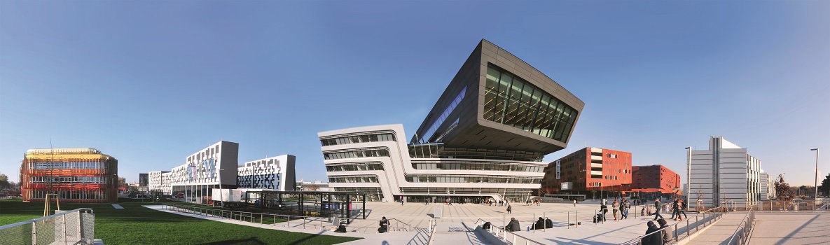 A WU (Bécsi Közgazdaságtudományi Egyetem) több mint 25.000 diákjával a legnagyobb közgazdasági és üzleti egyetem az Európai Unióban. Ennek megfelelően olyan helyre volt szükség, ahol az európai szellemű oktatás és kutatás méltó módon történhet. A komplexum épületeit 6 különböző építésziroda tervezte, köztük olyan nevekkel, mint Zaha Hadid, akinek a nevéhez az éjjel-nappal nyitva tartó könyvtár fűződik, vagy Hitoshi Abe, a NO.MAD Arquitectos, a CRAB Stúdió, úgyhogy igazi kortárs építészeti "gyűjteményről" van szó.