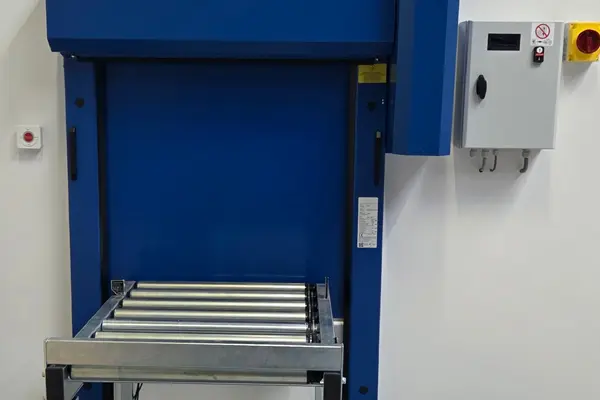 Tűzgátló szállítóberendezések: Tűzgátló lezárás szállítóberendezéseknél: Négy elem, amely tökéletesen kiegészíti egymást - a szállítóberendezés nyílászárója a Hörmann FHT EI2 90/120 tűzgátló emelőkapu és a V 3009 Conveyor gyorskapu, melyek HPS-Advanced nyitva tartó berendezéssel és a HPS-Drive szabadátjárás-vezérléssel vannak kombinálva.