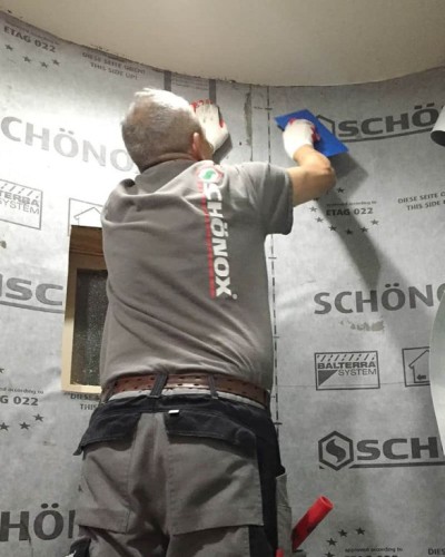 - A SCHÖNOX AB-t fektesse a ragasztóanyagba, mint egy tapétát, majd nyomja bele egy simító segítségével.