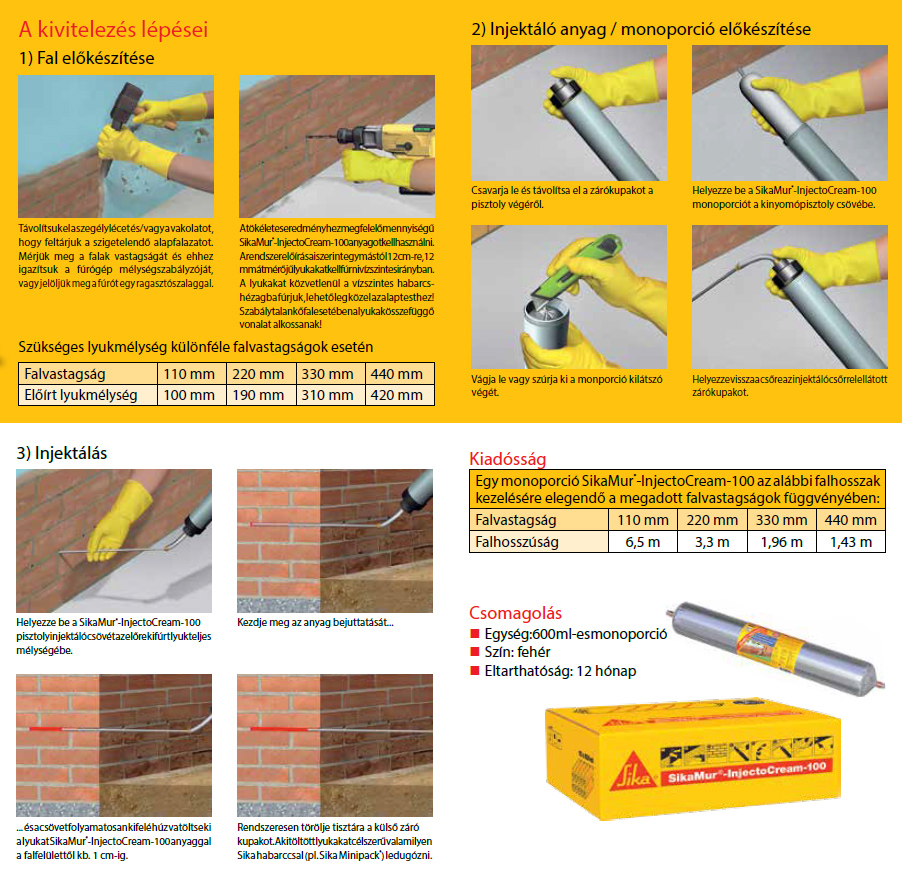 A SikaMur®-InjectoCream-100 egy újgenerációs talajnedvesség elleni szigetelő vízzáró krém, 600 ml-es monoporciós kiszerelésben. Az anyagot egy kinyomó pisztoly segítségével juttatjuk be a kifúrt lyukakba - nincs szükség speciális injektáló eszközre. Az egy munkafolyamattal beinjektált SikaMur®-InjectoCream-100 felszívódik a nedves falban, és ott egy vízzáró réteget képez és megakadályozza a további nedvesség felszívódását.